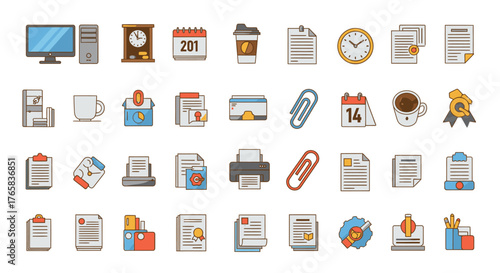Collection of various office-related icons, including documents, clocks, and coffee cups, in a colorful style.