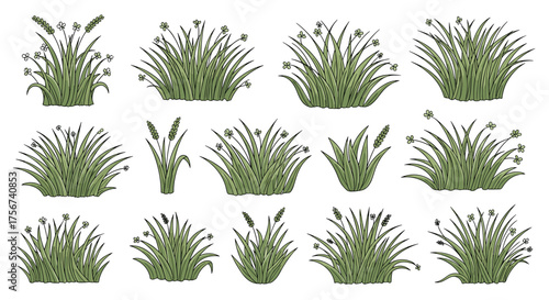 Collection of various types of green grass illustrations and decorative plants for design backgrounds and elements.