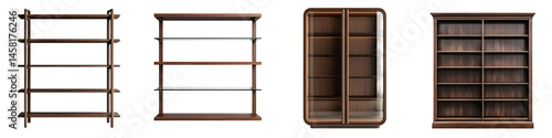 Collection of various wooden shelving units and bookcases