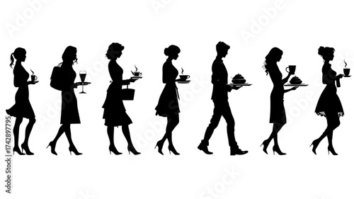 vector, isolated, waiter, waitress, silhouette, serving, eatery, dining, food, beverage, hospitality, service, people, figure, black, white, professional, culinary, style, activity, modern, classic, casual attire, elegant, teamwork, drink, plate, presentation, attire, catering, lineup, customer service, culinary arts, graphic design, business