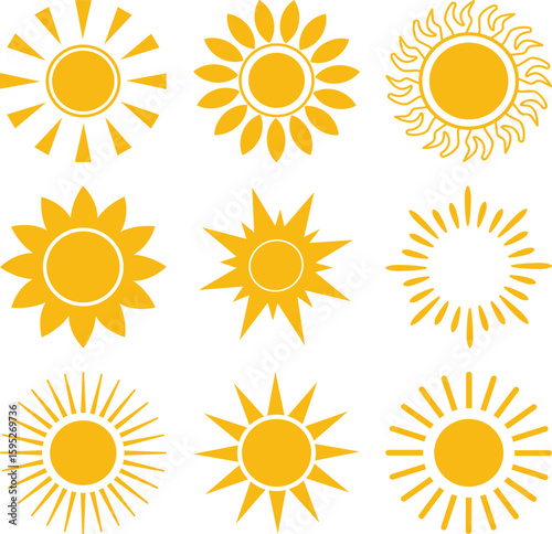 Collection of yellow sun icons in various styles and geometric shapes