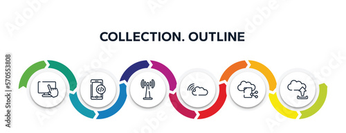 collection. outline outline icons with infographic template. thin line icons such as computer touch screen, phone code, wireless band, connected clouds by internet, file sharing on internet,