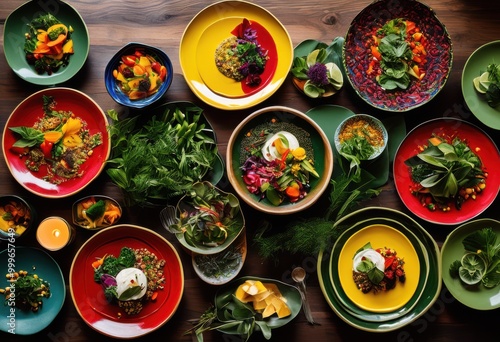 collection vibrant plant based dishes strategically plated colorful plates creating feast eyes, abundance, appeal, aromatic, artistry, beverage, bright