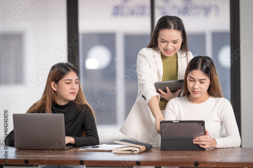 College instructors and advisors meet female college students to advise their research study. Education Concept Stock Photo