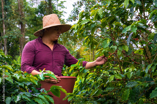 Colombian Farmer Harvesting coffee with hat (crop)