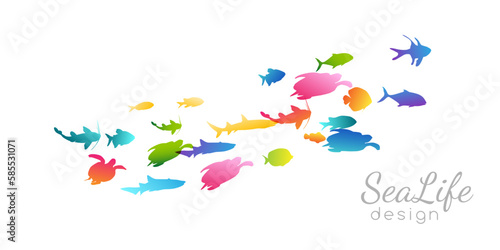 Colony of swiming sea or aquarium colorful fishes. Group of color silhouettes . Collection of isolated vector decoration.