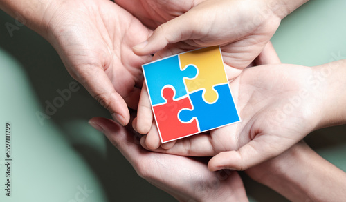 Color puzzle symbol of awareness for autism spectrum disorder family support. Father, Mother, Children holding jigsaw puzzle Autism World Awareness Day.