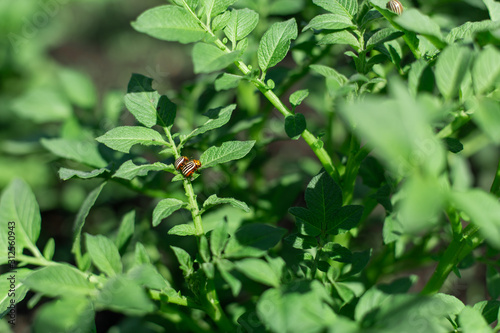 Colorado beetles eat potato crop in the garden
