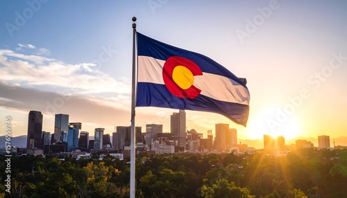 flag, colorado, sunset, city, skyline, city landscape, building, american, waving, proud, pride, view, horizon, landscape, panorama, gold, sun, light, urban, travel, tour tourism, america, state, symbol, proudly, fly, high, elevation, viewpoint, scene, beauty, nature, sky, tree, grass, mountain