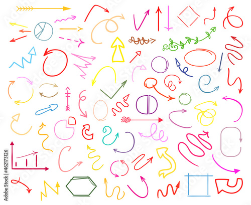 Colored infographic elements. Abstract circles, arrows and rectangle frames. Big set of different signs on isolated background. Hand drawn simple symbols for design. Line art