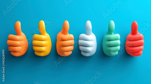 Colorful 3D Thumbs Up Gesture Icons in Orange, Yellow, White, Blue and Green on a Light Blue Background
