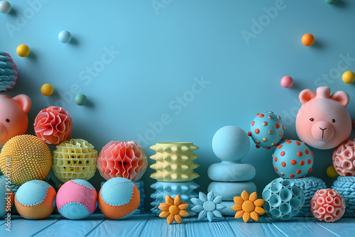Colorful 3D-rendered children's toys on a blue background, suitable for a nursery or toy advertisement.
