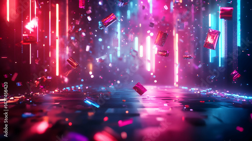 Colorful Abstract Background with Neon Lights and Falling Objects