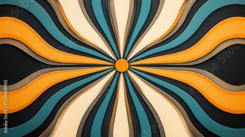 Colorful, abstract design featuring swirls of orange, teal, and brown radiating from a central point, creating a dynamic visual effect.