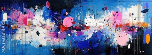 Colorful abstract painting with splashes, dots, and geometric lines in pink, blue, white, purple, orange, and black, conveying a dynamic and energetic mood