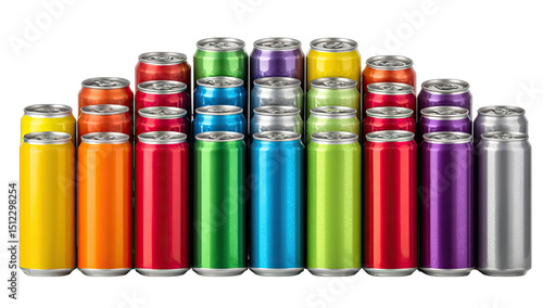 can, aluminium, beverage, drink, colourful, stack, cylindrical, container, metal, cardboard box, product, variety, hue, rainbow, stacked, row, display, arrangement, design, commercial, promotion, marketing, food, soda, consumer, industry, manufacturing, production, modern, bright, shiny, smooth, glossy, top, bottom, different, size, shape, collection, promotional