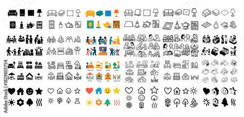icon, furniture, people, colourful, black, sofa, table, chair, lamp, community, group, home, decor, couch, simplistic, outline, bookshelf, symbol, gathering, house, modern, flat, minimal, design, art, graphic