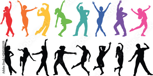 Colorful And Black Silhouettes Of People Dancing In Various Dynamic Poses rainbow