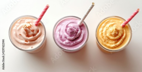 Colorful and Creamy Smoothies in Transparent Glasses with Stripes, Perfect for Hot Days and Refreshing Treats, Served on a White Background