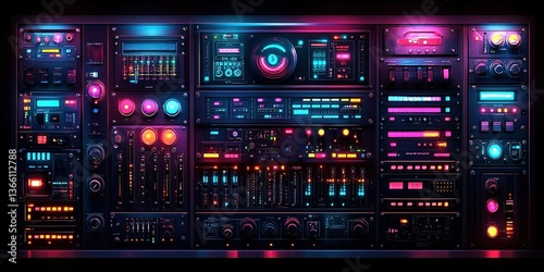 Colorful and intricate music production console with glowing lights in a modern studio environment at night