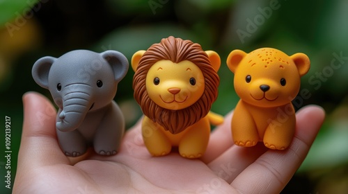 Colorful animal figurines of an elephant, lion, and bear held in a hand against a blurred background.
