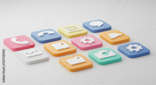 app, icon, icon, three-dimensional, render, rendering, phone, contact, electronic mail, message, setting, cog, camera, notification, bell, interface, mobile, application, program, software, digital, multimedia, cartoon, communication, technology, smartphone, symbol, design, graphic, colourful, pastel, white, background, flat, square, circle, photo, image, visual, art, creative, shape, web, development, studio