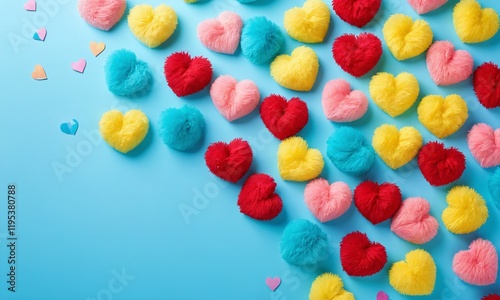 Colorful arrangement of fluffy heart-shaped decorations on a blue background. Valentine’s Day, date, engagement, love, wedding, background