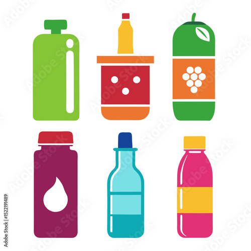 bottle, container, colourful, assortment, stylised, vector, illustration, design, graphic, flat, icon, beverage, liquid, plastic, glasses, food, drink, juice, water, product, shape, label, package, isolated, healthy, nourishment, minimalist, modern, bright, vibrant, collection, variety, presentation, art, drawing, line, form, set, group, different, medicine