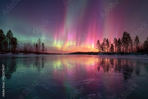 aurora, borealis, night, lake, glacé, tree, colourful, vibrant, sky, ice, winter, landscape, nature, scenic, stunning, aethereal, beautiful, magical, pastel, pink, purple, green, light, colours, northern, light, cold, calm, serene, majestic, evening, midnight, panoramic, forest, twilight, dramatic, spectral, amazing, breathtaking, photographic, marvellously