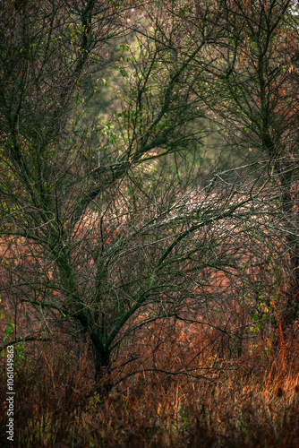 Colorful autumn forest , yellow and orange colors .Nature photography in the forest .Pathway in the woodlands, landscape photography in the rainy weather.Red leaves on trees , red colors .Fall nature