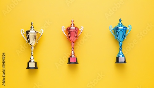 Colorful award trophies set against a yellow backdrop in vivid lighting. Created with generative AI technology