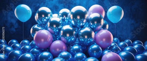 Colorful balloons featuring blue and pink shades set against a textured blue background, capturing a festive and vibrant atmosphere.