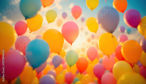 Colorful balloons floating high in the sky, creating a festive and joyful atmosphere, perfect for celebrations or outdoor events.