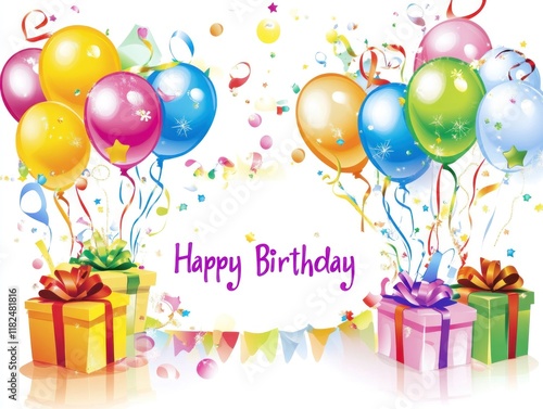 Colorful balloons, gifts, confetti, and "Happy Birthday" text on white background.