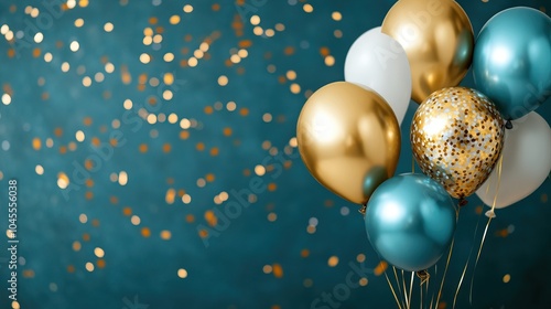 Colorful balloons in gold, teal, and white are set against a shimmering backdrop of scattered confetti, creating a festive atmosphere.