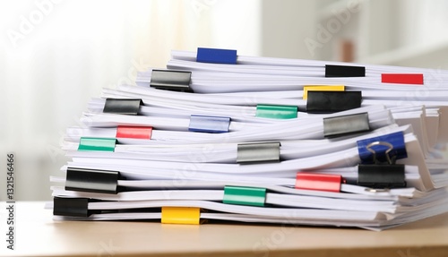 Colorful binder clips with sheets of paper on table indoors, closeup
