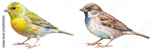 bird, illustration, nature, art, wildlife, colourful, sparrow, canary, feather, realistic, detailed, avian, education, species, ornithology, green, yellow, brown, fauna, natural, graphic, design, beauty, animal, painting, ecology