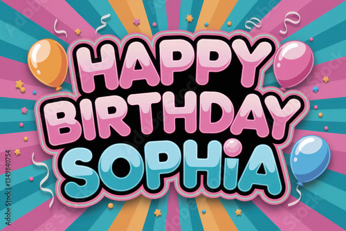 Colorful Birthday Celebration Design Featuring 'Happy Birthday Sophia' with Balloons and Festive Background