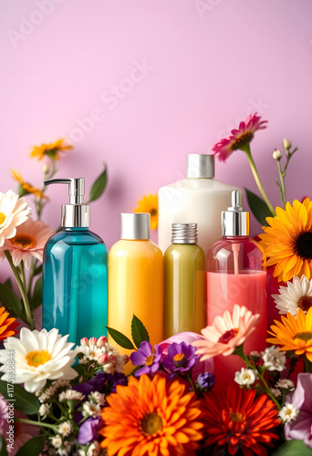 Colorful bottles of beauty products arranged with flowers, with white tones