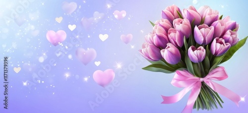 Colorful bouquet of tulips with a dreamy background filled with hearts and sparkles