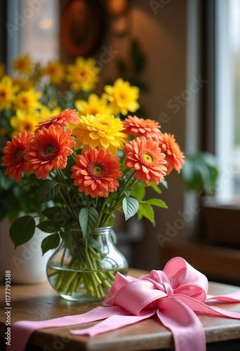 bouquet, flower, orange, yellow, ribbon, pink, cosy, table, decoration, indoor, beauty, arrangement, vibrant, natural, cheerful, bright, floral, elegant, charming, lifestyle, greenery, home, warmth, detail, fresh, inviting, atmosphere, design, centrepiece, spring, summer, joy, celebration, softness, aesthetic, serenity, relaxing, colourful, joyful, harmony, comfort, flower petals