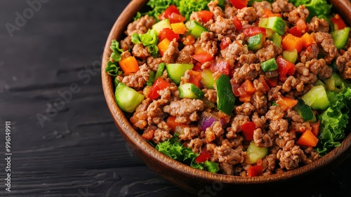 Colorful bowl of healthy salad with ground meat, mixed vegetables, and greens on a dark background.