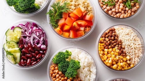 Colorful bowls filled with various fresh vegetables, grains, and legumes arranged neatly, showcasing a healthy and vibrant meal prep.