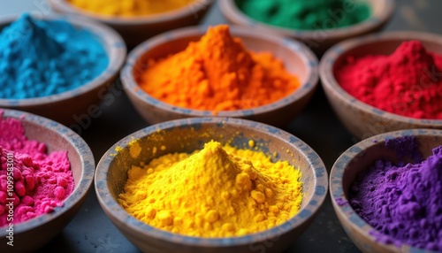 Colorful bowls filled with vibrant powders. Assortment of different colored pigments. Variety of hues in bowls. Creative display of colorful powders in wooden containers. Artistic arrangement of