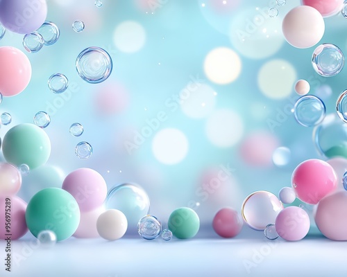 Colorful bubbles and spheres float gracefully in a dreamy, soft-focus background, creating a whimsical and serene atmosphere.