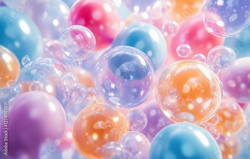 Colorful Bubbles Floating in a Dreamy Background Surrounded by Soft Pastels and Shimmering Lights, Perfect for Abstract or Children Themes