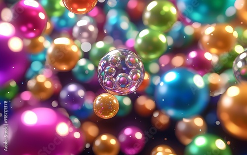 Colorful bubbles floating in a vibrant background, showcasing a playful and whimsical atmosphere with bright reflections.
