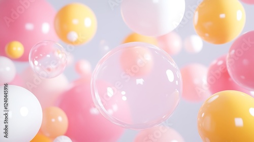 Colorful Bubbles Floating in Air with Soft Background in Cheerful Pastel Tones and Light Reflection
