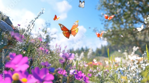 butterfly, wildflower, meadow, nature, spring, colourful, flower, landscape, wildlife, pollinator, fluttering, outdoors, flora, fauna, sunny, vibrant, scenery, blooming, insect, garden, blue skies, vivid colors, natural beauty, picturesque, serenity, ecosystem, flower petals, scenic view, rural, calmness, environment, habitat, sunny day, beauty, fresh air, biodiversity