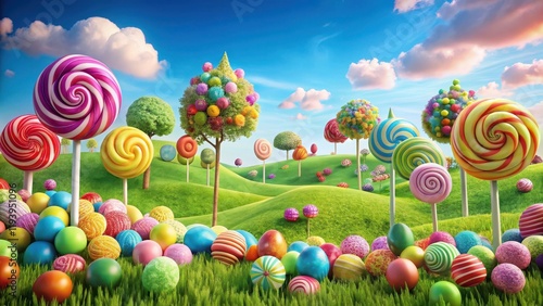 Colorful candy land with gumdrop trees and lollipop flowers in a bright green meadow, candy land landscape